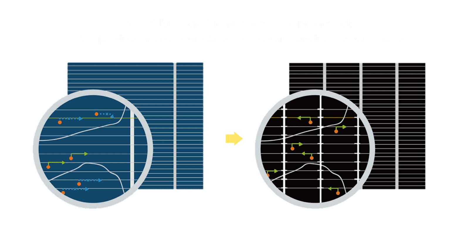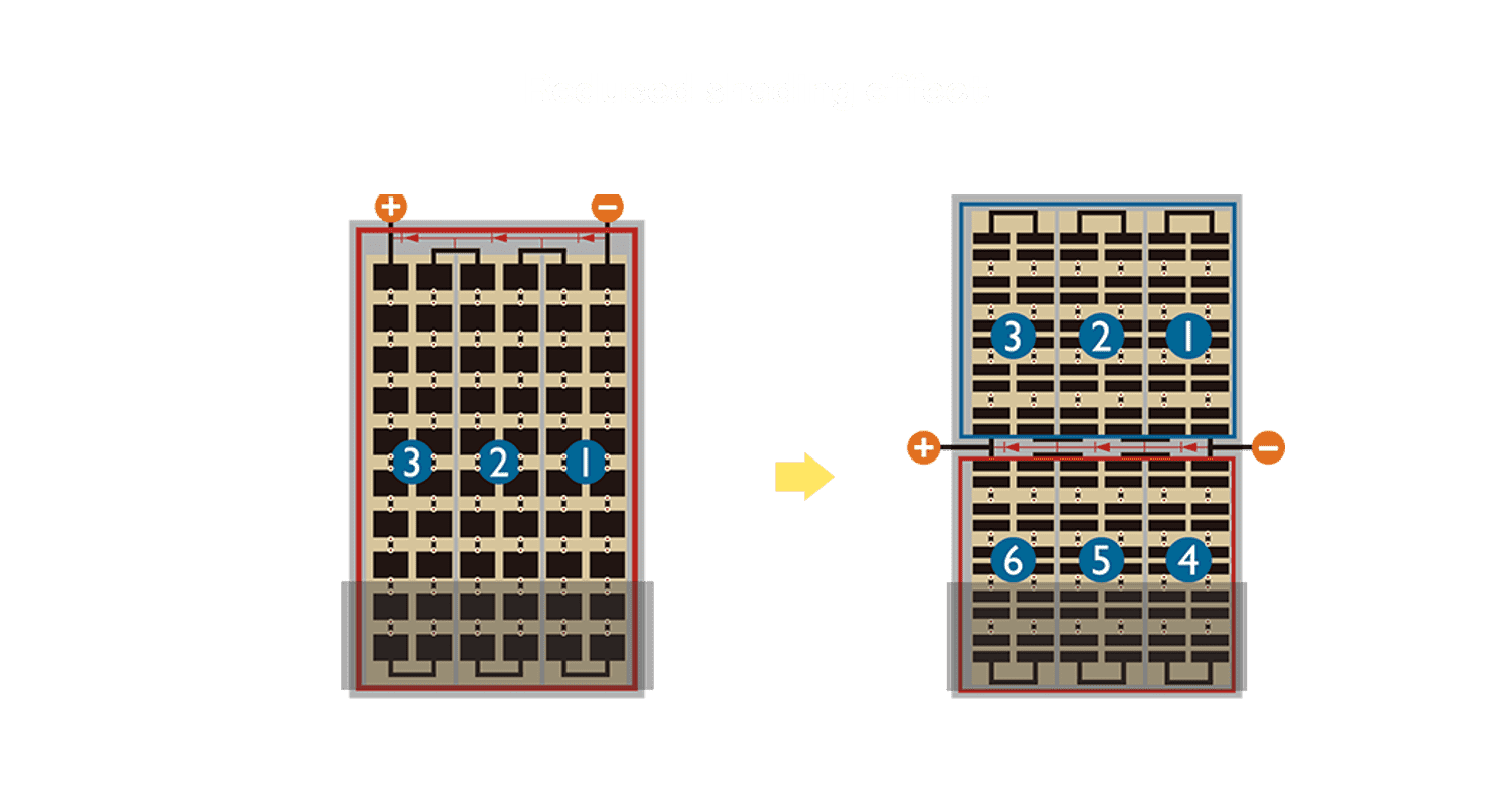 - 结合半切电池,,降低遮阴影响、、、提升模组抗隐裂能力、、、、并减少电阻损耗,,,,进一步提升模组发电效能。。。。