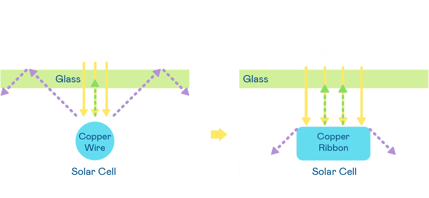 - 电池使用多条铜导线 (Copper wire) 于电池片上形成较短的电流路径,,,,提高电流收集效率,,采用圆形设计的铜导线较传统扁平式的铜焊带 (Ribbon),,,可增加入射至电池的光线量。。